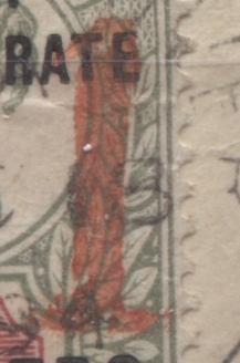 Here is the genuine surcharge. Note how the colour of the ink is a vermilion, but how the design is still fully visible through it. Not also that the number appears weak in spots. Here is a closer look at the "1":